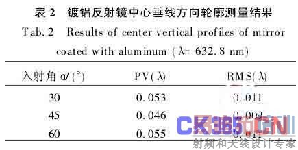 大口径干涉仪斜入射测量SiC反射镜时,斜入射角的选取很受干涉仪平台尺寸大小的限制,因此本文采用口径100 mm的ZYGO GPI-XP型移相干涉仪进行了不同入射角下绝对检验结果的比对。此干涉仪的空腔精度PV值为0.031λ、RMS值为0.005λ(此处λ=632.8 nm),被测镜为100 mm口径的镀铝反射镜。分别选取入射角为30,45和60°按照文中实验方法对中心垂线进行斜入射绝对检验,结果如表2所示。由此可知,3个入射角下测量结果基本一致。