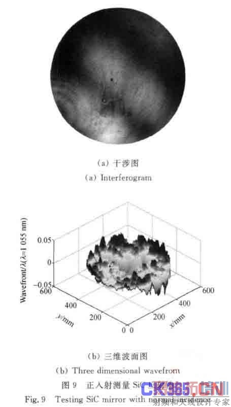 干涉仪正入射测量SiC反射镜的表面面形时,由于SiC反射镜的表面反射率很高,测试时形成的参考光和测试光光强不匹配,造成干涉条纹的对比度下降,如图9(a)所示。被测SiC反射镜的面形在600 mm口径内正入射测量结果为PV=0.079λ,RMS=0.009λ,如图9(b)所示。由此可见SiC反射镜的制造精度已经接近于干涉仪的空腔精度,正入射测量的结果受到参考面面形精度的限制,因此采用正入射测量无法精确给出被测SiC反射镜的面形分布。