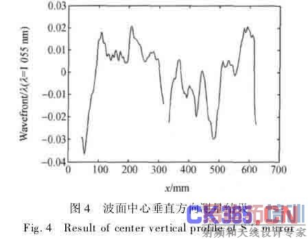 从上述测试结果可以看出,被测件的面形精度已经与干涉仪系统的空腔精度非常接近,测试所得的波面结果并不能精确反应被测件表面的真实信息。因此需要采用斜入射绝对检验方法测量该SiC反射镜多条垂线方向上的绝对面形分布。首先测量参考平面A和反射平面B构成的空腔,其中心垂线的测量结果如图3所示, PV =0.049λ,RMS=0.013λ。得到空腔中心垂线方向的结果将作为系统误差在斜入射测得的结果中扣除。