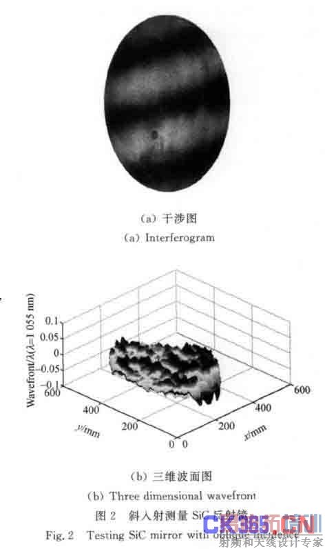 采用本课题组自主研制的大口径近红外相移平面干涉仪斜入射测量了630 mm口径的SiC反射镜。该干涉仪采用卧式斐索型结构,工作波长λ=1 055 nm。有效口径(600 mm)内参考平面与反射平面构成的空腔精度指标PV值达到了0.067λ,RMS值为0.010λ。选择反射率约为0.04的600 mm口径微晶反射镜作为反射平面,以45°作为入射角按图1(a)所示进行测量,所得的干涉图如图2(a)所示。斜入射测试的三维面形分布如图2(b)所示,被测SiC反射镜的面形斜入射测量结果为PV=0.098λ,RMS=0.014λ。