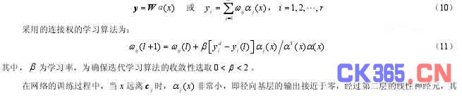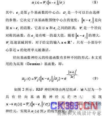 输出也接近于零;当 ( )jα x大于某一数值(如 0.05)时才对相应的权值产生影响;当 x 与jc 很接近时,径向基层的输出接近于 1,经过第二层的线性神经元其输出值就更靠近第二层权值。这样训练得到的 RBF 神经网络就具备局部逼近网络学习收敛快的优点。