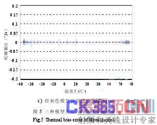 将微机械 IMU 置于温箱中,进行-40~60℃的高低温试验, x 陀螺零偏随温度的变化如图 4 所示。分别应用传统的多项式模型[9]、RBF 神经网络以及经由灰色模型预处理的 RBF 网络对 x 陀螺零偏输出进行辨识。然后,利用辨识得到的数据对温度变化下陀螺的零偏进行补偿,补偿后的输出如图 5 所示。三种模型补偿后的误差均值及方差如表 1 所示。