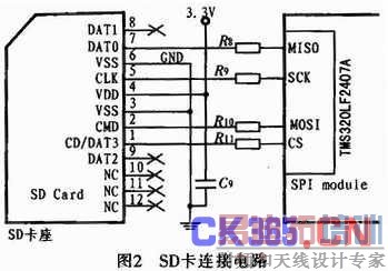 SD是新一代半导体存储设备卡,其外形及引脚定义如图1、表1所示。SD卡工作电压为2.0~3.6 V,最大读写速度达10MB/s(4位数据线并用),并且提供了SD和SPI两种通信模式。在使用时,主机只能通过其中一种方式与SD卡进行通信,该模式通过上电后检测Reset命令来决定。本系统采用SPI方式操作SD卡,因为该方式具有接口电路简单(DSP芯片TMS320LF2407A提供SPI接口),并且通信协议也十分简洁的优点。因为DSP芯片TMS320LF2407A的SPI模块高电平刚好是3.3 V,所以SD卡座可直接与TMS320LF2407A的SPI引脚连接,其连线方式如图2所示。
