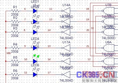 使用发光二极管来显示运行结果。发光二极管正端接5V电源,当非门的右边输入的是高电平,则经过非门以后变成低电平,则发光二极管亮;当非门的右边输入的为低电平,则经过非门以后变成高电平,则发光二极管熄灭。