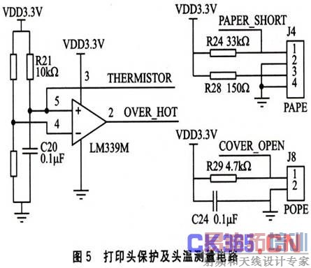 如果打印过程中打印头过热,就必须停止打印,否则会烧坏打印头。打印头内置热敏电阻由THERMIST()R连接到外部检测电路,经过LM339M比较器,一旦温度超过极限温度,就通过OVER_HOT脚发出低电平给主控芯片.从而可以及时采取相应的保护措施,如图5所示。