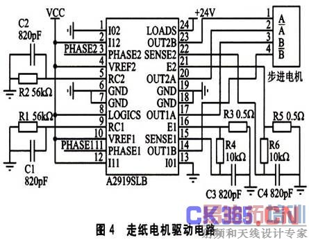 打印机走纸控制采用双极斩波驱动的步进电机来实现。本设计采用Allego公司的专用双全桥PWM步进电机驱动器A2919SLB来驱动电机,如图4所示。驱动器输出双路可直接驱动步进电机,PHASEl和PHASE2分别由.ARM控制器输出相应脉冲来控制输出脉冲频率,从而得到理想的速度。走纸电机驱动电路如图4所示。