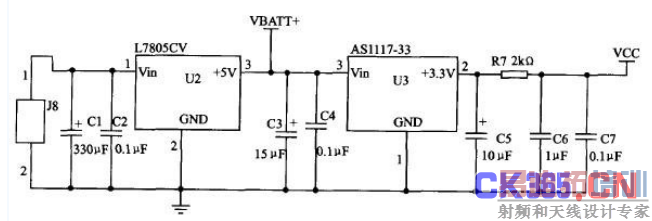 最小系统工作电压为5 V DC。由于TC35i 模块的突发耗电电流峰值可达3 A,故外加稳压器件必须达到足以提供该额定电流的条件。另外,电源的指标不仅仅有电压,而且功率容限等指标都要满足要求,故采用图2的设计方案。在该系统中,开关电源芯片LM7805 完成12 V到 5 V 的转换,电源电路主要由LM7805和AS1117-3.3这2个三端稳压电源模块构成,电源模块AS1117-3.3接收LM7805输入的5 V电平,输出为整个单片机系统提供+3.3 V工作电压,连到ZIF连接器的1~5引脚,为TC35i提供+5 V、500 mA的充电电压。电源的输出基本不会受外部输入变动干扰,而且有效的消除了电磁干扰。