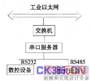 串口服务器真正的优势以及价值的体现并不是表现在直连方式的应用上, 将设备连接到以太网上是它重要的目的, 通过串口服务器将数控设备连接到以太网上,其接线方式非常简单,只需要将串口服务器连接到集线器或者交换机上即可,通过设置串口服务器的IP 地址, 就可使串口服务器成为以太网上的一个节点,从而使连接到该串口服务器的数控系统连接到以太网上,通过该组网方式能够将不同的数控系统,不同形式的串口(如RS232、RS422 和RS485), 连接到以太网上, 实现数控系统的异构组网。该组网方式可以将整个企业的数控系统连接到网络上,在组网过程中, 除了可以利用交换机和集线器扩展外,还可以利用工业以太网交换机, 如MOXA EDS508, 可以扩展不同型号的串口服务器,实现数控设备的灵活组网,实现了网络资源的共享和对所有数控系统的集中管理、控制,为网络制造技术搭建平台,网络结构如图4 所示。