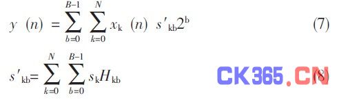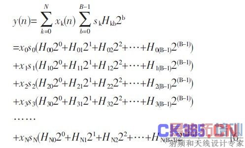 用FPGA设计FIR滤波器的关键在于如何处理占用大量资源的乘法单元。分布式算法(DA) 的提出可将乘法运算转换为移位相加运算, 从而节约硬件资源。若令Hk为滤波器系数, xk (n) 为n时刻的采样输入, y (n) 为n时刻的系统响应, 那么, 式(1) 就可以等效于下式:
