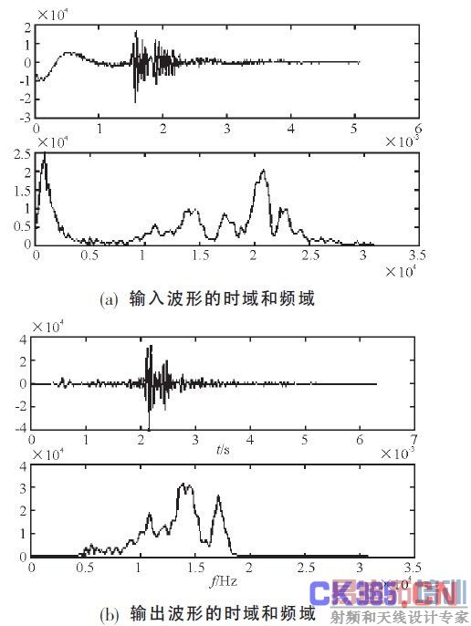 图5所示是滤波器在Matlab中的仿真结果, 可以看出, Modelsim和Matlab的仿真结果一致。在频域上, 对比图5 (a) 和图5 (b) 可以看到, 其滤波后的波形只保留了5kHz~18kHz的频谱部分, 这说明流水线CSD-DA结构的数字滤波器设计正确。