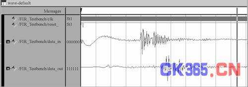 为了验证滤波器的功能是否正确, 可对本设计在Modelsim中进行仿真。若原始波形为带噪声的声波信号, 那么, 其滤波的结果如图4所示。