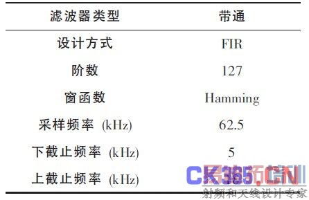 FDATool是Matlab信号处理工具箱里专用的滤波器设计分析工具, 该工具的主要作用是按照设计指标提取滤波器系数。用FDATool设计数字滤波器的关键在于滤波器类型、窗函数、滤波器阶数、截止频率等参数的选择。其中窗函数用于决定阻带衰减和过渡带带宽, 常用的窗函数有矩形窗、汉宁窗、海明窗和布莱克曼窗。矩形窗和汉宁窗阻带衰减较小, 而布莱克曼窗过渡带较大, 相对来说, 海明窗更符合设计要求, 它的最小阻带可以达到54.5dB, 归一化过渡带带宽为3.11π/M (滤波器阶数N=2M+1)。针对声波测井信号, 设计时应进行表1所列的参数设置。