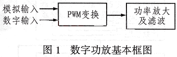 数字功放由于其效率高、易与数字音源对接等优点而在现实生活中具有越来越广泛的应用。它主要包含两部分,图1为数字功放的基本框图。其中PWM变换大致有两种,一是模拟PWM,即将输入的模拟信号或数字信号经D/A后与三角波进行比较,这种变换必须要有频率上百kHz、线性度好、满幅的三角波,而且还要有高速模拟比较器,否则将影响PWM波形在解调后的波形,这些都将增加成本和设计复杂度(使用集成D类功放或D类控制芯片另当别论)。二是数字式PWM,即将输入数字信号或模拟信号经A/D后与计数器相比较,即用计数的方法代替三角波,从而避免了三角波非线性所引起的失真。同传统的模拟方式相比,数字方式具有设计简单,效率更高,抗干扰性更强等优点。而Atmega8单片机中的定时器1可以工作在PWM模式,它只要将其AD中的值移到PWM的输出比较寄存器中即可完成PWM调制,实现起来相当简便。