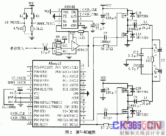功率放大部分采用两片IRF7389,每一片中内置一对VMOS管,N沟道和P沟道的导通电阻分别为46、98mΩ烿GS=4.5V时牐最大输出功率为30W。此外,IRF7389还内置高速恢复二极管,能降低谐波失真。图2中的C17 、C16是加速电容,可用来改善激励波形,以使VMOS管迅速由截止转换为导通,或由导通迅速转为截止,以达到减少死区时间,改善输出波形之目的。图2中的 R7、R8主要起保护作用。