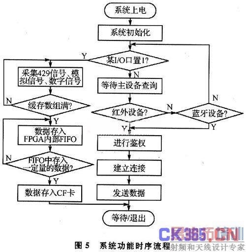 系统的功能时序流程如图5所示。DSP部分程序用C语言编写,结合硬件电路对数据采集、数据传输进行处理和控制。主要的中断应用有ARlNC429信号采集中断和红外通信请求中断。系统的工作流程以时序控制流程为主线。系统初始化之后,进行任务选择与执行。若特定的I/O口置1,则进入数据存储程序,采集数据并存至CF卡;若I/O口置O,则进入数据下载程序,等待主设备的连接请求,鉴权并建立相应的连接,读取CF卡数据,并通过无线通信模块向主设备发送。