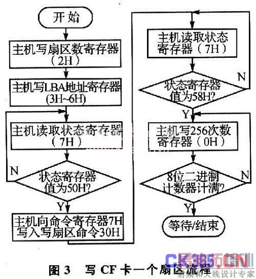 写CF卡一个扇区的流程如图3所示。每次向CF卡存储数据时,应该先获取上次存储到的扇区的LBA地址,从而获得此次存储的起始扇区地址。为了记录每次存储到的扇区的地址,将LBA地址为0的扇区保留,专用于记录扇区地址。在开始一次写操作之前,应该先读取LBA地址为O的扇区,获得上次存储的LBA地址;然后加1获得此次写操作的LBA地址,并向指定的扇区写数据。