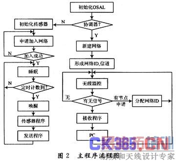 ZigBee网络属于无线自组网络,有两种设备类型:全功能节点(FFD)和半功能节点(RFD)。RFD一般作为终端节点,FFD可以作为协调器或路由。软件设计包括RFD程序和FFD程序,它们均包括初始化程序、发射程序和接收程序、协议栈配置、组网方式配置程序以及各处理层设置程序。初始化程序主要是对CC2430,USAR串口、协议栈、LCD等进行初始化;发射程序将所采集的数据通过CC2430调制并通过DMA直接送至射频输出;接收程序完成数据的接收并进行显示、远传及返回信息处理;PHY,MAC,应用层,网络层程序设置数据的底层、上层的处理和传输方式,主程序流程如图2所示。