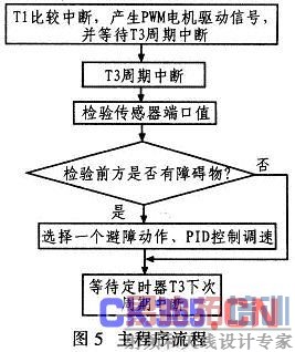 小车在普通情况下处于前进状态,当T3定时器发生周期中断时,进入程序开始检测光电开关的信号线端口,如果有障碍物则从避障程序中选择一个执行,如果没有障碍物则小车继续前进并且等待定时器的下一次中断,其程序流程如图5所示。
