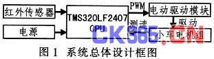 小车为3轮结构,前面2个轮分别由2个电机独立驱动控制,后面1个万向轮作为支撑轮。小车安装有3个红外传感器,分别位于车头的左、中、右部位,用于采集环境信息。车体规格为:车身板距地7.5 cm,车长25 cm,车宽12 cm,车轮半径5.5 cm。速度控制采用定频调宽的PWM调速,并应用速度反馈和闭环PID控制,从而实现小车精确的速度和位置控制。