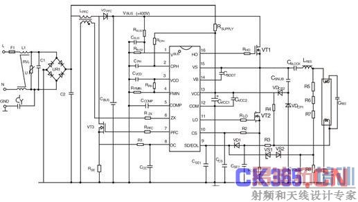 由IRS2168D组成的荧光灯电子镇流器电路如图3所示。