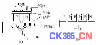 由文章前面部分的分析可知:利用直流电通过PN结就可以使热量由高温物体传向低温物体,改变电流的流向就可以很方便的实现制冷和制热的转换。用半导体制冷不用考虑因制冷剂泄漏而导致的环境污染问题,并且整个系统无焊接管路。图3为半导体制冷系统的模型结构图。它是由许多N型和P型半导体颗粒互相排列而成,而N-P之间以一般的导体相连接而形成一完整线路,通常是铜、铝或其他金属导体,最后用两片陶瓷片夹起来。接通直流电源后,电子由负极(-)出发,首先经过P型半导体,在此吸收热量,到了N型半导体,又将热量放出,每经过一个N-P模组,就有热量由一边被送到另外一边,造成温差,从而形成冷热端。