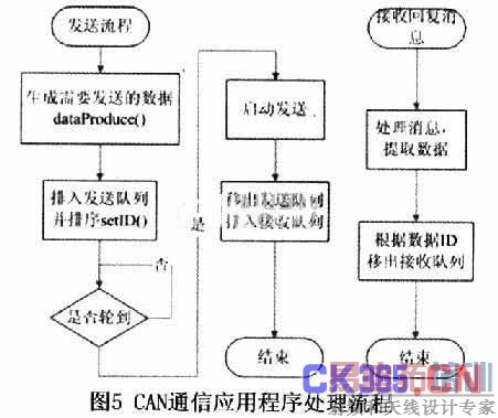 (2)接收处理。首先需根据ICOD的值来确定当前准备好数据的接收缓冲区。接收帧处理过程中首先读取帧的ID值,确定当前帧的数据是哪个节点发送来的,并据此把帧中数据字段的数据存放在相应的位置。