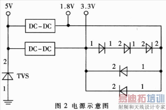在本系统中采用单-5V电源供电,可避免由多电压供电带来的潜在不稳定性,其设计示意图如图2所示。其中,1.8V提供给CPU和北桥所需的core电压。3.3V为VIO电压以及sdram等电路的供电电压。为提高系统的可靠性,接在5V电源上的TVS管可实现电路过压保护,而由二极管组成的电路可提供对3.3V和1.8V电源的掉电保护。