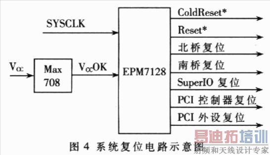 为了保证CPU正常的上电复位时序和各个系统芯片之间的复位顺序,设计了如图4所示的系统复位电路。该系统的核心为-EPLD器件EPM7128。电源监控芯片max708在检测到输入电压V∝稳定时给出200ms左右的V∝OK信号,满足系统时钟稳定所需要的至少lOOms的时间。EPLD片内逻辑电路检测到V∞OK信号后,内部计时电路开始工作,准确地给出CPU和所有系统芯片的复位信号。