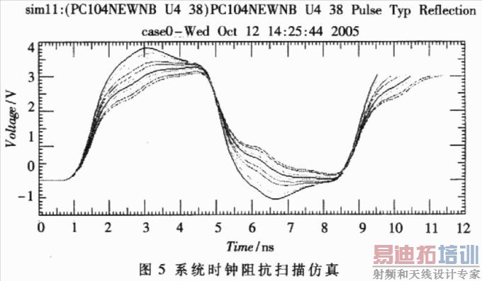 为提高时钟电路的稳定性,通过仿真确定了系统各时钟特性阻抗和端接方式,并通过在布线时控制相关时钟信号严格等长来控制传输延迟。图5所示是采用源端匹配方式、驱动信号为133M Plus信号、板级时钟阻抗为50Ω时.扫描匹配电阻从20D~70Ω、步进为5Ω时的反射仿真波形。从图中可以看出,所有时钟波形信号都满足单调性,但在某些区域有较大的过冲。限定过冲在300mV以内,匹配电阻值应在40Ω-55Ω之间,具体可由实际测试结果决定。仿真工具采用的是Cademe的PCB SI。用该工具同时也可对EMI、串扰进行仿真。