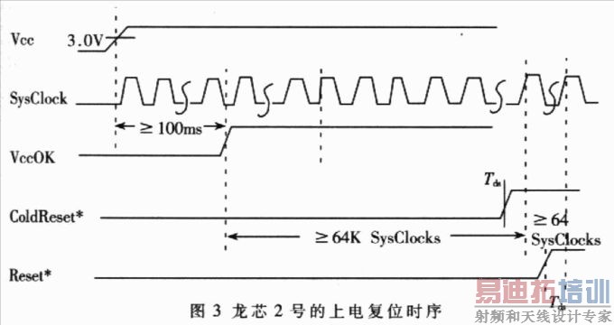 GT64240北桥芯片缺少对龙芯2号CPU进行复位的功能支持,在配套使用时需设计CPU复位电路。同时由于在系统中采用了不同厂家的芯片,因此确定CPU及各个芯片之间的复位顺序也是一个很关键的问题,复位顺序不正确将导致系统不能正常工作。龙芯2号的复位时序如图3所示。为保证时钟的稳定性,应使V∝(CPU IO电压)稳定在3V以上至少lOOms后,再由复位电路向CPU发出VccOK信号,此后确保冷复位信号(ColdReset*)至少持续64K个系统时钟周期,而软复位信号(Reset*)应在冷复位信号无效后至少64个系统时钟周期后置为无效。这样可确保CPU能进入正常工作状态。