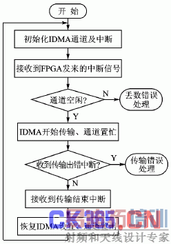 MPC8260内部的程序处理流程如图4所示。MPC8260预先初始化两个IDMA通道:通道的源地址和传输数据长度等信息与FPGA中的缓冲区一一对应。当收到FPGA的中断信号之后,如果此时对应的IDMA通道空闲,则在中断处理程序中发出CP命令开始接收数据,同时将对应的IDMA通道置忙状态;否则,在FPGA中可能发生了未读取的数据被覆盖的情况,MPC8260进入错误处理程序。在数据传输结束时由DMA控制器发送CPM内部中断到内核,在中断处理程序中一方面要恢复IDMA通道的参数设置,另一方面要把该IDMA通道置闲状态等待下一次传输的开始。