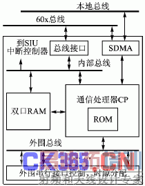 MPC8260是Freescale公司主要针对数据通信领域而设计的一种嵌入式PowerPC微处理器,具有双核结构:1个高性能的MPC603e 64位RISC微处理器内核和1个专为通信设计的32位RISC通信处理模块(Communication Processor Module,CPM)。CPM的原理框图如图2所示。除了PowerPC内核和CPM之外,MPC8260还包含一个灵活的系统接口单元(System Interface Unit,SIU)主要用于控制与外部总线的接口。