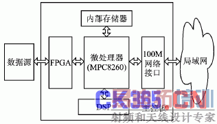 主控板的硬件核心是嵌入式微处理器MPC8260,负责系统软件的加载、数据的分发以及与外界命令控制的交互。软件上,采用高性能的VxWorks嵌入式实时操作系统。从天线接收到的射频信号经过变频和A/D变换之后作为数据源连接到FPGA,FPGA对接收到的数据进行中频变换和信道估计等预处理后,在CPU的控制下将数据传输到本地内存,最后CPU对数据打包后进行快速分发。