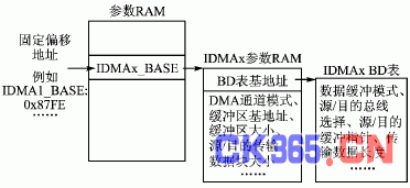 BD(Buffer Descriptors)表是用于指定传输方式、源/目的地址和数据长度等基本信息的数据结构。BD表的基地址由参数RAM中IBASE寄存器的值指定。IDMAx_BASE寄存器的地址是固定的,如IDMA1_BASE在偏移RAM基地址0x87FE的位置。CP就是通过IDMAx_BASE寄存器找到IDMA参数RAM,再通过IBASE找到BD表的顺序初始化IDMA通道的。具体的寄存器配置可以参考文献[1]第19章的IDMA编程示例。