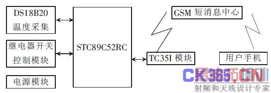 系统的硬件设计部分包括微控制器模块、DS18B20温度采集模块、继电路开关控制模块、电源模块和TC35I模块。