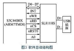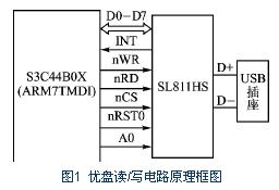 S3C44B0X是Samsung公司开发生产的为嵌入式设备提供的一个低成本、高性能的ARM7TMDI核处理器,其最高运行频率可达66 MHz。SL811HS是Cypress公司的一款遵从USB1.1协议的嵌入式Host/Slave USB芯片;可以支持低速和高速模式,能自动侦测低速模式1. 5 Mbps设备和高速模式12 Mbps全速设备。由于具有8位数据总线的支持,使该芯片可以较为简单地与微控制器相连,SL811HS芯片与S3C44B0X的接口较为简单。本系统中ARM读/写优盘原理框图如图1所示。