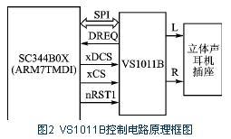 VS1011B是一款单芯片的MP3解码芯片,在国际MP3业余爱好者中影响较大,集成解码、A/D转换、音频放大等功能。VS1011B与S3C44B0X接口为SPI接口,其连接电路原理框图如图2所示。