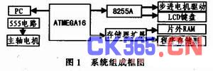 在本系统中,采用AVR系列产品ATMEGA16作为控制芯片,使该系统拥有独立的微处理器和独立控制主板电源等,具有实用可靠和稳定的特点。其中PC机用来处理加工数据,转换成下位机需要的数据格式,并传输数据。在与上位机的通讯中,本设计采用PC并行口的数据传输方式。实验证明,满足雕刻机高速加工的要求。系统扩展8255 A作为并行口输出,A口用于控制X、Y向步进电机的方向和进给脉冲。B口用于向LCD写显示数据,C口用于输出LCD的控制信号。由于ATMEGA16只有16 K字节的系统内可编程Flash、512字节EEPROM和1 K字节SRAM,无法满足雕刻机程序以及数据的存储。故需要通过扩展片外程序存储器以及数据存储器,来满足加工时的要求。系统中的主轴转速的控制,采用独立于ATMEGA16的电路。本设计中,通过555电路来产生脉冲信号,来驱动主轴电机的转动。