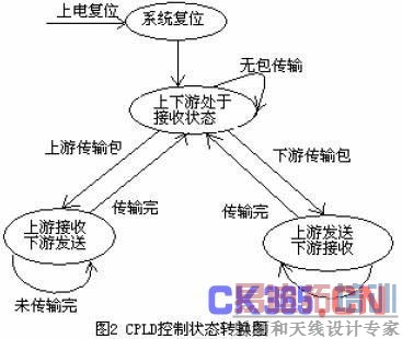 CPLD是整个系统的控制核心,软件的设计好坏关系到整个系统的稳定性和可靠性。CPLD采用 XILINX公司的 XC95144XL,具有集成度高、可靠性好及工作速度快等优点,开发软件功能强大、灵活易用、升级方便。考虑到 USB信号速度高,要求切换快,便于升级,功耗低,综合各种因素选用该芯片。CPLD的主要功能是: 1)对 50MHZ的时钟信号进行分频,产生系统所需的各种时钟信号;2)为电源的上电顺序提供监测和控制信号; 3)实时判断信息包并及时为 USB收发器提供转换控制信号;4)为 TUSB2046B提供复位信号,监测四口 HUB的 Suspend信号并产生复位信号为上游设备; CPLD控制逻辑状态转换图如图 2所示,系统上电后,CPLD初始化,并为 TUSB2046B产生足够的复位信号,使其正常稳定工作,然后使自己处于上下游接收状态,若上游有信息包,则立即转换下游处于发送状态,让包信号完全通过,包结束时,又回到上下游接收状态。若下游有信息包时,按上述方法上传。