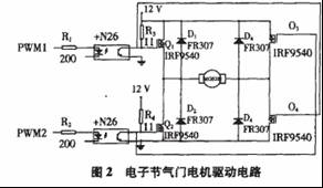 要控制节气门的开度,就需要控制其直流电机的输出扭矩,该扭矩与电机线圈中的电流成正比。如图2所示,直流电机PWM功率驱动电路:DSP产生PWM信号通过光电耦合器控制功率MOS管来完成对直流电机电源的高频开闭,最终控制节气门的开度。由于节气门片需要正反两个方向转动,所以需要搭建一个H桥电路来满足对直流电机双向控制的需求。光电耦合器实现上、下级之间的电器隔离,防止有高电压大电流进入主控电路,干扰DSP的正常工作。4个二极管具有消除电压尖峰的作用。