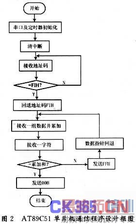 在实验板上还集成了51单片机来组成最小控制系统,所选用的AT51单片机的串口有4种工作方式,用于多机异步通信时选用方式2或方式3,数据帧格式为:1位起始位,8位数据位,1位停止位,进行串行通信前要对串口进行初始化,设置波特率和串行口工作模式,设定单片机的地址码为F1H1,在传送数据前先联络地址码,如地址码正确则传送数据,否则继续联络地址码,数据的通信采用累加和校验的方法,即每传送一组数据(个数自定,设为100个),校验一次累加和是否正确,正确则回送00H,否则回送FFH1,通信可以由中断传送方式和查询方式,本文采用查询方式,选择波特率为1200b/s,定时器T1作为波特率发生器,选用晶振为12MHz,定时器T1工作于模式2,定时器初值为0E6H,AT89C51单片机的通信程序框图如图2。