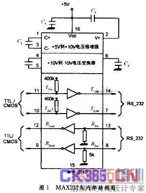 MAXIM公司的MAX232/MAX232A接收/发送器是MAXIM公司特别为满足EIA/TEA2232E的标准而设计的,他们在 EIA/TIA2232E标准串行通信接口中日益得到广泛的应用,他们具有功耗低、工作电源为单电源、外接电容仅为0.1μF或1μF,采用双列直插封装形式、接收器输出为三态TTL/CMOS等优越性,为双组RS 232接收发送器,工作电源为+5V,波特率高,仅需外接0.1μF或1μF的电容,其价格低,可在一般需要串行通信的系统中使用,MAX232外围需要 4个电解电容,是内部电源转换所需电容,其取值均为1μF/25V宜选用钽电容并且应尽量靠近芯片。如图1所示。