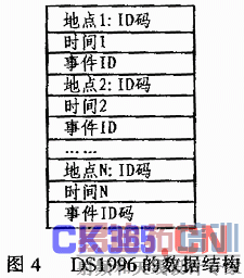 巡逻人员根据要求的路线对小区的各个点进行巡查,每到一个地方,只要用收集器与安装于各地址的信息纽扣轻触,便可记录地点ID码及当前时间。针对发生的损坏及意外事件,巡加急人员同样只要轻触事件本表达该类事件信息的信息纽扣,即可记录该地点所发生的情况,所有信息都被保存在非易失性存储器DS1996中,其数据结构表如图4所示。