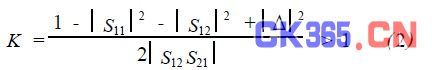 因为有源器件都存在内部反馈,反馈的大小取决于放大器的S参数、匹配网络以及偏置条件,当反馈量达到一定程度时,将会引起放大器输入或输出端口出现负阻,产生自激振荡,因此在做端口匹配前首先要判定放大器是否绝对稳定,射频放大器绝对稳定的充分必要条件是: