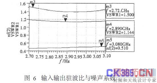 放大器的输入输出驻波比与噪声系数如图6所由图6可知,输入输出驻波都低于1.6dB,特别是输出驻波比小于1.2dB,主要是因为输出匹配电路按最大增益设计,有效地降低了输出端反射系数。放大器输出端口噪声系数在整个频带内低于0.6dB,噪声匹配良好。