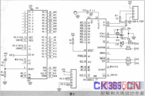 电路的主体为ATMEL公司的51系列芯片ATMEL89S52(以下简称S52)和PHILIPS公司的并行传输USB接口芯片PDIUSBD12(以下简称D12)。S52相信读者已经非常熟悉了,最高24MHz的主频,256字节的RAM,4组8位I/O口,没有什么特别的功能,一切中规中矩,本设计在此仅用到一个外部中断。但这同时也说明,任何51内核(带总线)的单片机都可以适用。