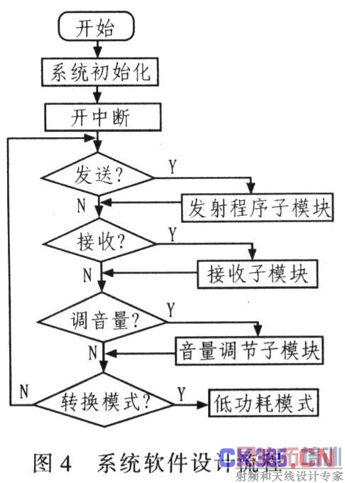 程序采用中断程序+循环主程序的方式。将最紧急需要立即处理的事件,设置为高优先级中断,以便在多个中断同时申请中断时能够优先得到响应。中断2~6分别是MCU与DSP和CC1101的数据收发及键盘信号监测。由于MSP430的速度很快,其他事件的处理都放在主程序中,循环执行。为了节省能量,若无外部信号要处理,主程序循环一段时间后,系统转入低功耗模式中。MCU程序的开发环境为IAR Systems,采用汇编语言编写。图4为系统软件设计流程。