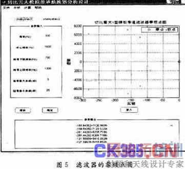 图4为切比雪夫2型模拟带通滤波器的幅频特性和极点分析计算结果;图5为切比雪夫 1型模拟带通滤波器零极点分析计算结果。分析结果表明,该软件有助于模拟带通滤波器的分析设计。