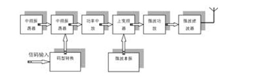 微波直接调制发射机的方框图如图1所示。来自数字终端机的信码经过码型变换后直接对微波载频进行调制,然后,经过微波功放和微波滤波器馈送到天线,由天线发射出去。这种方案的发射机结构简单,但当发射频率较高时,频调制发射机的中频功放设备制作难度大,而且在一个系列产品多种设备的场合下,这种发射机的通用性差。