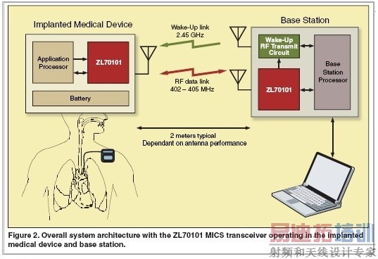 ZL70101工作于植入设备和外部基站(见图2)。基站包括发射2.45 GHz唤醒信号的附加电路。系统一旦通过2.45 GHz唤醒信号启动,就通过402MHz到405MHz MICS频带收发器交换数据。